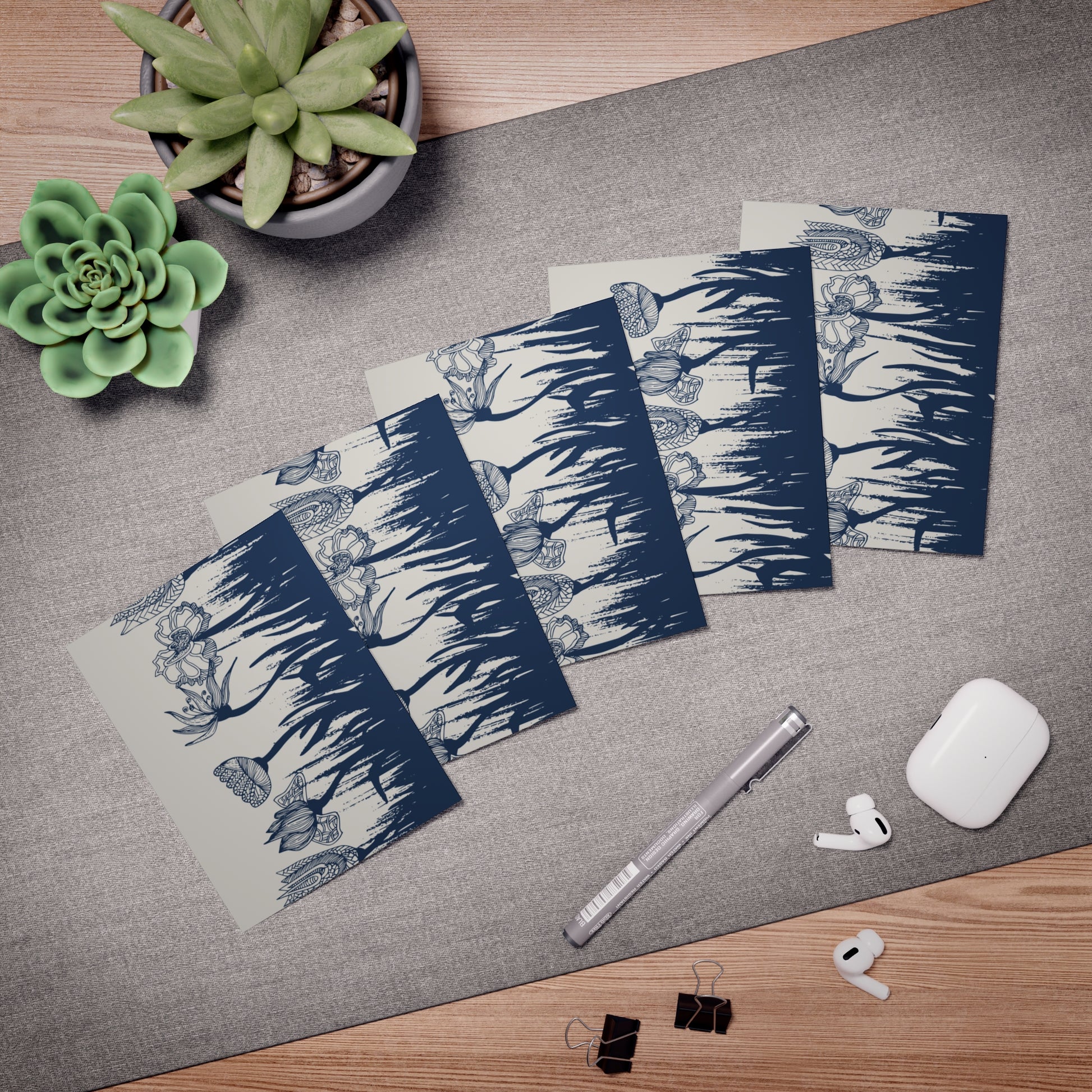 These five greeting cards carry the quiet energy of meditative doodling—intricate floral zentangle patterns that invite slow looking. Each card feels hand-drawn, full of winding petals, tiny patterned leaves, and gentle negative space that calms the eye. Hold one and you get a small pause: a moment of softness to tuck into a thank-you note, a thinking-of-you message, or a birthday sentiment. The uncoated heavyweight paper keeps the texture tactile, while vibrant printing preserves the fine lines and color contrasts from the original doodles. Presented with matching white envelopes and assembled in the USA, the set reads like a little ritual—an understated way to send care for birthdays, quiet celebrations, or simple hello notes.