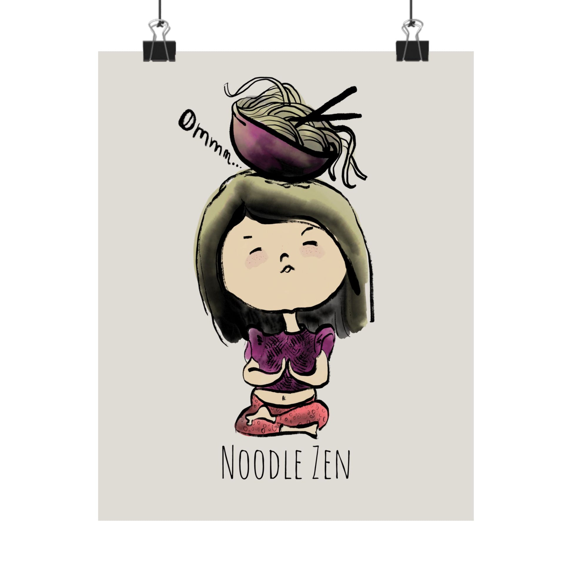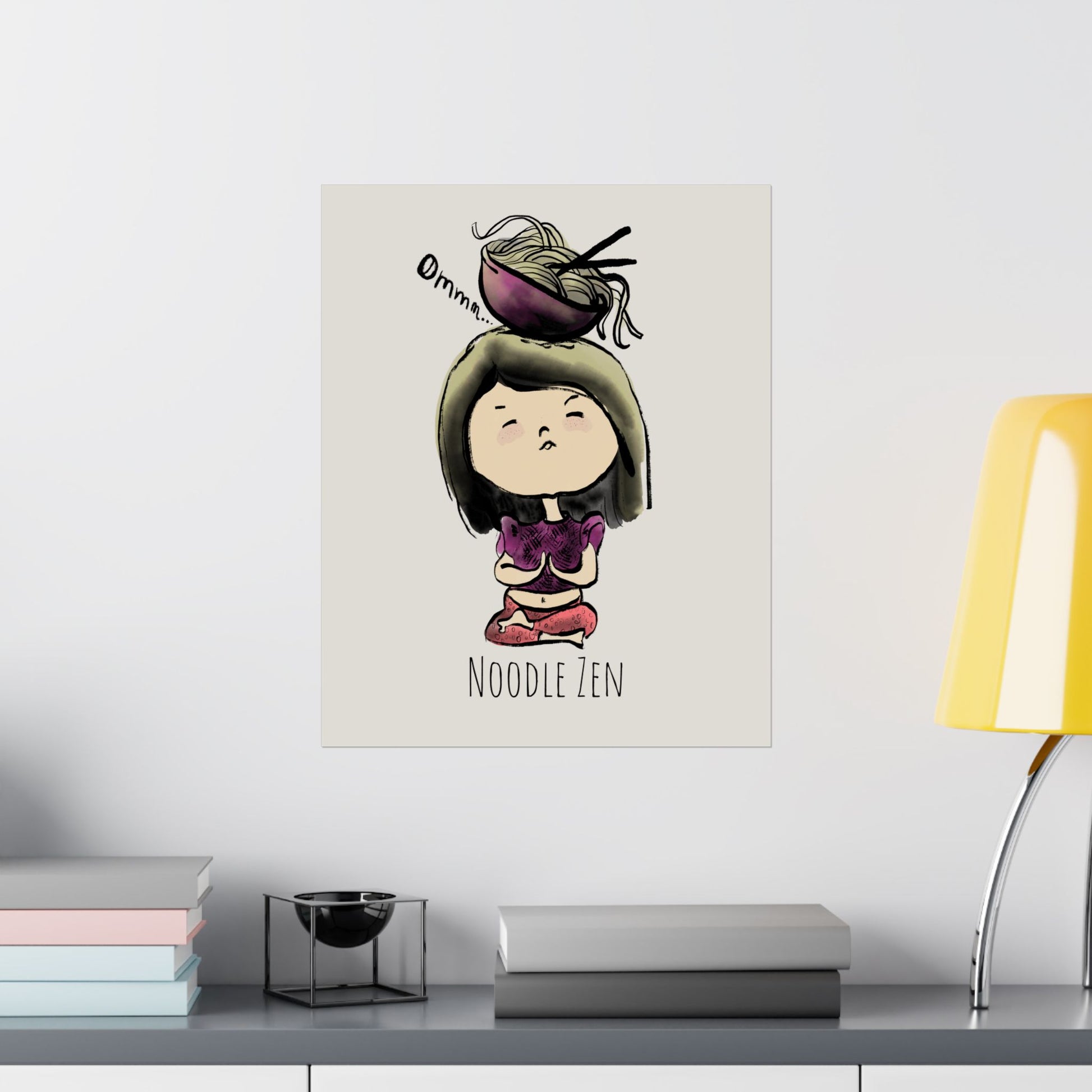 A quietly whimsical poster that captures a moment of playful calm: an illustrated Asian girl seated in meditation, balancing an overflowing bowl of noodles atop her head. The matte vertical format softens the colors and invites a closer look at the delicate linework and joyful absurdity. Hung in a kitchen, a studio corner, or a tiny dining nook, this print brings a gentle, contemplative smile—part humor, part stillness. It reads like a private joke between noodle lovers and slow-living seekers, brightening a room without shouting. The archival, museum-grade paper and giclée reproduction hold the illustration’s rich tones and subtle details so the scene stays lively for years. For adults who collect art that’s cute, clever, and quietly meditative, this poster adds a human, slightly mischievous touch to everyday spaces and gatherings like dinner parties, art swaps, or cozy nights in.